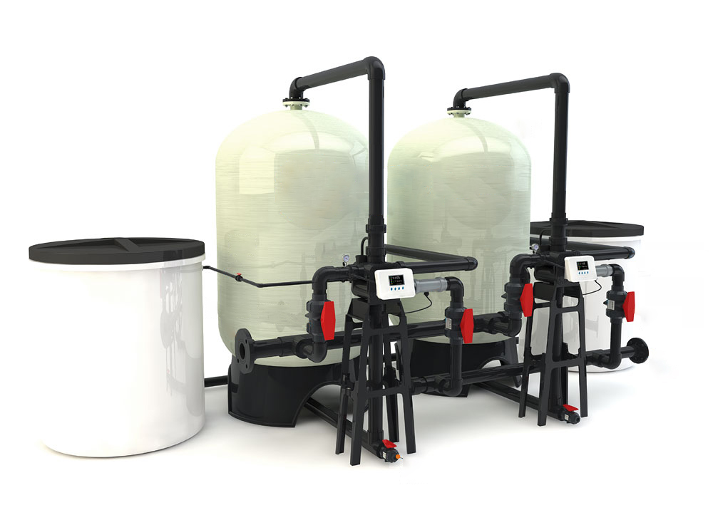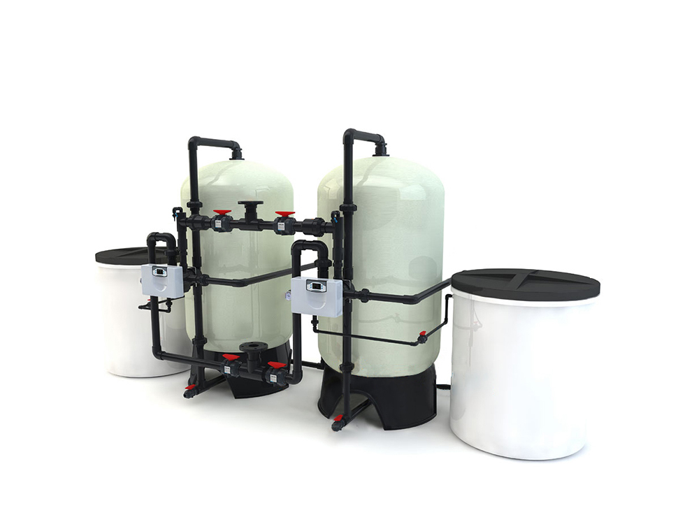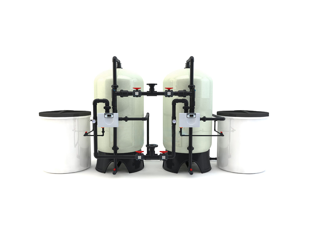 雙閥雙罐型軟化水系統主要針對大流量且需要不間斷供水的方案;雙閥雙罐型軟化水系統可以做到同時供水分開反洗,從而達到大流量供軟化水,而且不間斷的目的。